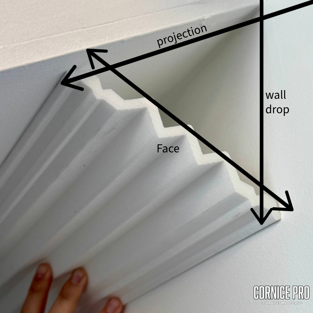To measure the drop you would place a ruler or a tape measure at the bottom of the cornice and measure straight up towards the ceiling.